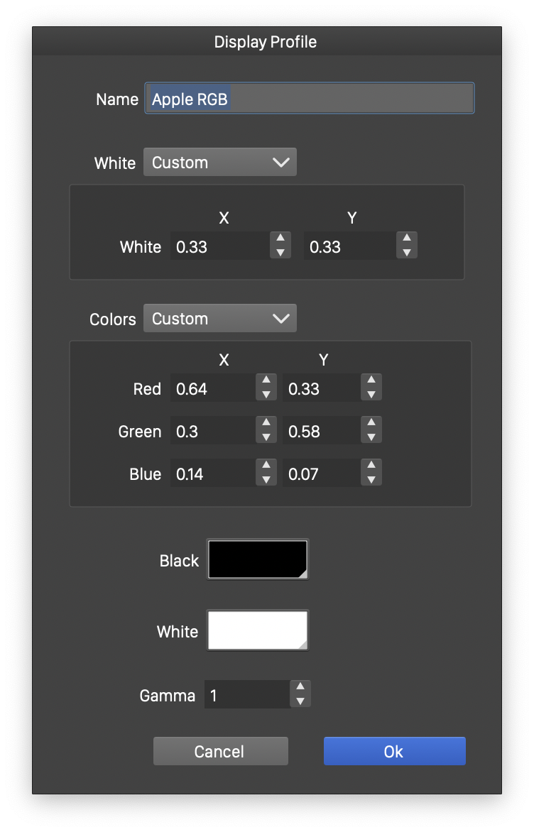 - Display - Opens a list of display color profiles. These are RGB profiles that can be used for display calibration. A display color profile can be edited by selecting the Custom option from the list. The Load and Save options can be used to access existing display color profiles from a file or to create a new display color profile. The display color profile editing is described below.