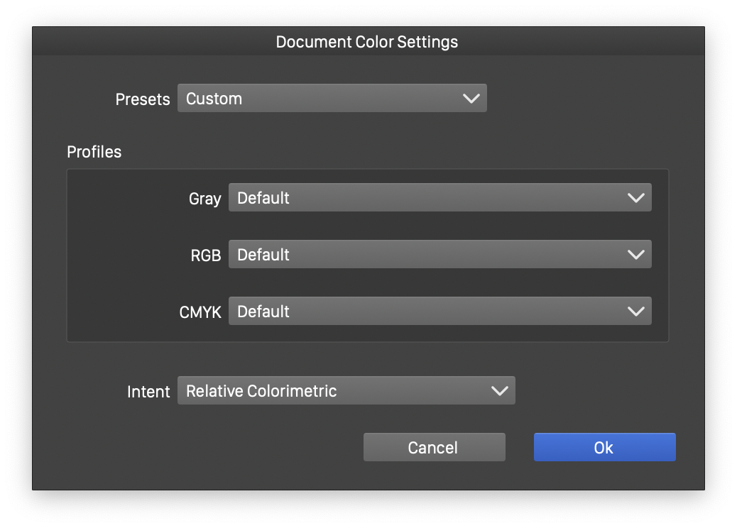 The color profile settings used to convert color for the display and for printing, and to define the Gray, RGB and CMYK color modes used in the document may be document specific. This requires that the color profiles and associated settings to be stored in a document. To enable color profile embedding into a document, check the Embedded Color Profiles in the Document Setup view Color section. If left unchecked, the color profiles will not be stored with the document