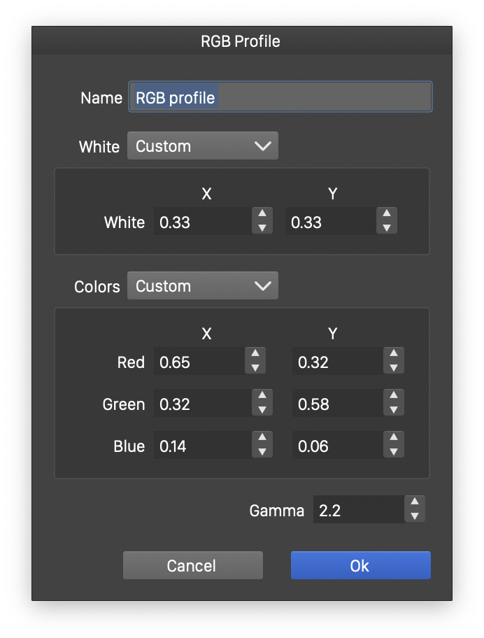 - RGB - Opens a list of RGB color profiles used to describe RGB colors stored in the document. RGB color profiles can be edited (selecting Custom), loaded from a file (selecting Load) or saved to a file (selecting Save). The editing of RGB color profiles is described below.