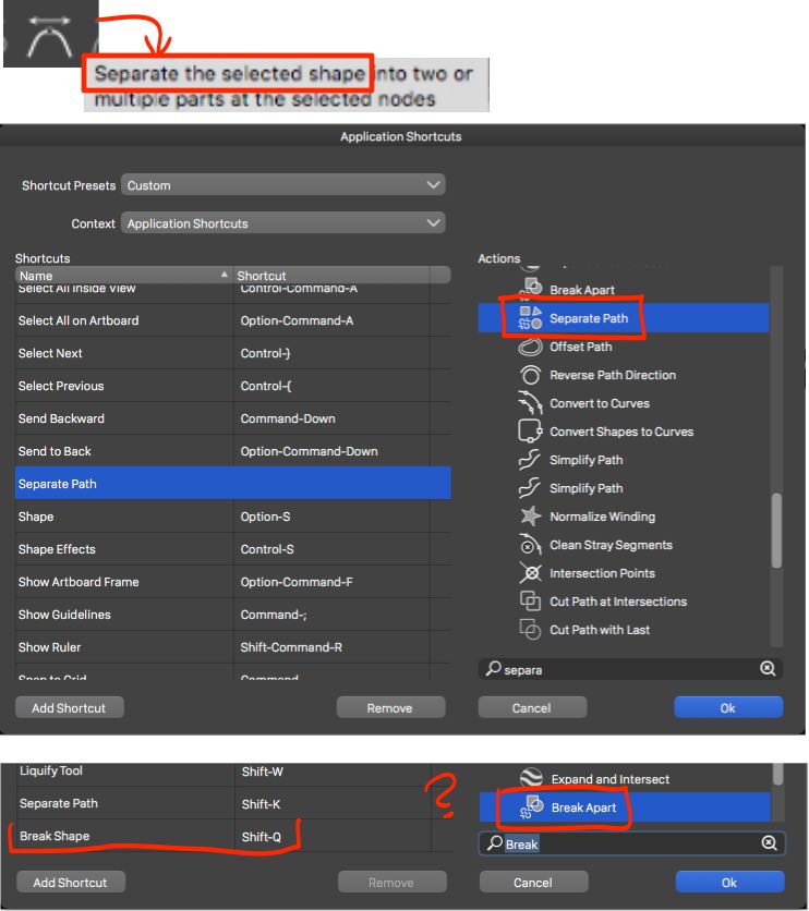 @Raaskot I will try to improve the tool tips. The icon breaks the shape at a node. "Break Apart" creates separate shapes from shapes with multiple paths. "Separate Path" is the same as break apart, but a bit smarter, keeps the holes and intersections between shapes in one shape.